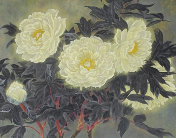 画題の「玄黄」は、本来「天地」を表わす言葉ですが、大地の黄色を牡丹に、天の漆黒を葉に託して描きました。