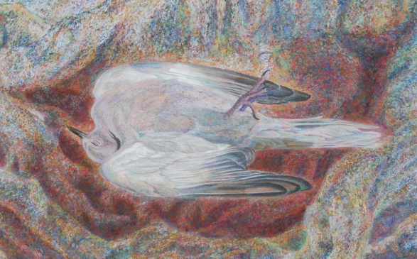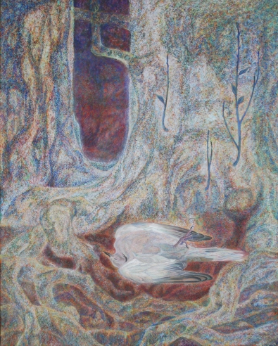 | 伊豆に住んでいたころ、自宅そばの山道で、鳥の遺骸を見つけました。獣に食べられ羽根が散乱した、死骸というよりは残骸といったほうがよいものでしたが、黒い土の上に落ちた白い羽毛が印象的で、しばらく立ち止まって、なんの気なしに眺めていました。 一か月ほどして、飼っていたシラコバトが死んでしまい、その遺骸を写生しているうち、ふと、山道で見かけた鳥の羽根を思い出しました。 子供のころは、死はとても遠く、また恐ろしいものでもありました。しかし年を経るにつれ、子供の時よりは、死をずっと身近に感じるようになりました……それは、自分が死ぬであろうということより、むしろ、生きていく過程で、自ずと、いくつかの身近な人の死を、経験してきたからかもしれません。 鳥の死骸を描くのは、今は思いもつかないことですが、この絵を描いた時は、なにか気構えることもなく、とても自然な気持ちで描いていました。 |