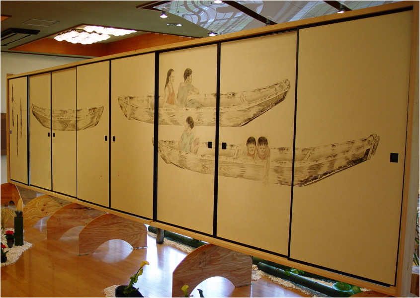 | 徳島県美馬市脇町に、「うだつの町並み」といわれる、昔の藍商人たちの屋敷が連なる場所があります。その一角に建つ藍商佐尚邸に飾られている襖絵です。二間を吉野川に見立て、その間を仕切る襖の、一方に上流に架かる「祖谷のかずら橋」を、もう片方には、下流で舟遊びをする人達を描きました。 吉野川には、独特の形状の「かんどり舟」という川船があります。『吉野川を描いてほしい』という依頼だったのですが、取材に行った吉野川でその船を偶然見つけ、川ではなく、船を描くことに決めました。船を作っている大工さんのところに取材に行き、実際に作っているところも拝見しました。 絵では、船の上に付ける板をはずし、乗っている人が身を沈めるような形にしました。板の上に座ると、画面上での安定感が得られなかったためですが、十分に取材しないと、なかなかそうした変更をする勇気はでません。良い悪いは別として、描くときは『確信する』または『思いきる』ことが大切だと、思います。絵の取材とは、結局その『思いきる』ためのものなのかもしれません。 |