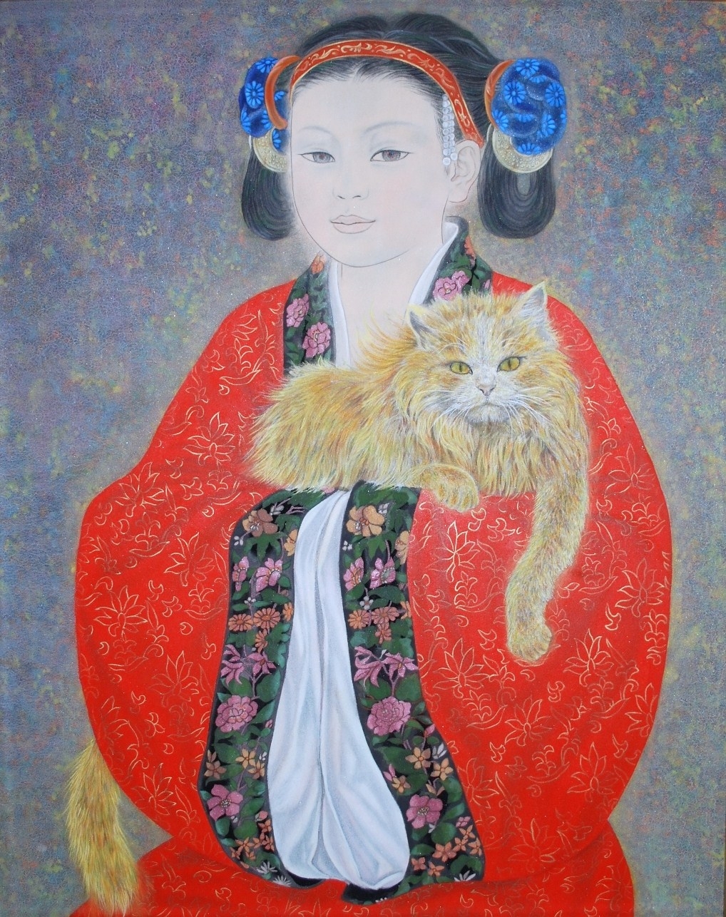 秦檜は、北宋を滅ぼした金との講和を推進し、英雄として名高い主戦派の将軍「岳飛」を謀殺するなど、後世に悪名を残した、いわゆる姦臣といわれる人です。しかし、後に中国を支配した清王朝では、「秦檜」は好意的に評価もされています。金は、清の祖に当たる同じ女真族の国であったからですが、歴史というのは、その時代や考察する人の目でどのようにも解釈が変わっていく、これは分かり易い例だと思います。 あるとき、この崇国夫人の愛猫が、突然行方不明になりました。南宋の都「臨安府」は、上へ下への大騒ぎになります。大捜索にも関わらず、結局猫は見つからずじまい。捜索に加わった役人達は、職務怠慢で処罰されそうになります。困りはてた役人が、珍しい金色の獅猫(長毛種の猫。宋時代に流行りました)を崇国夫人に献上したところ、なんとか事なきを得ました。 猫一匹に都の大勢の大人達が右往左往した中、当の少女は無邪気に、涼しい顔で、金色の獅猫を抱いている………この絵はそんな姿を描きました。 |