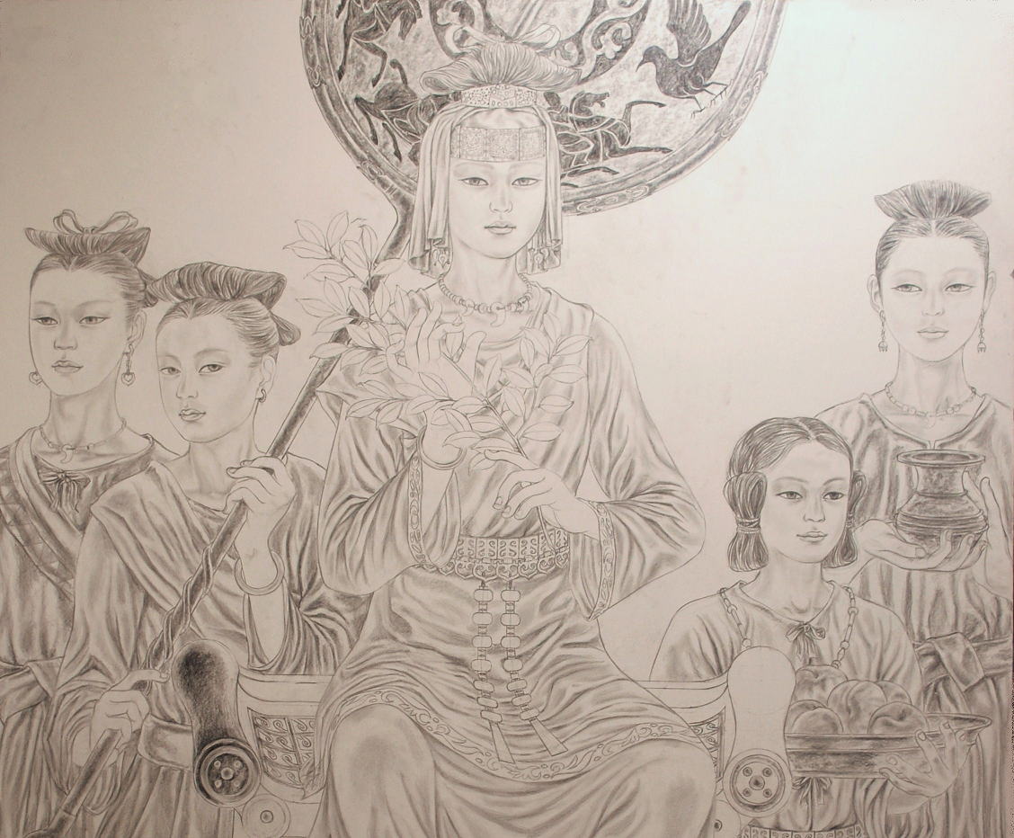 | 臺與(とよ。魏志倭人伝 では 壹與 )は、邪馬台国の卑弥呼の姪です。卑弥呼の死後、倭国が乱れ争いが起こる中、わずか13歳で女王に即位し、国を一つに纏めたとされています。 背景の扇には、邪馬台国にはなかった騎馬と、神話の八咫烏を描き入れました。この二つの中に、有史以来日本に押し迫ってくる様々な苦難や災害に、凛と立ち向かっていく日本の姿を象徴させました。 この国の黎明期の臺與の姿に平和への祈りを託しつつ、この絵を描きました。 |