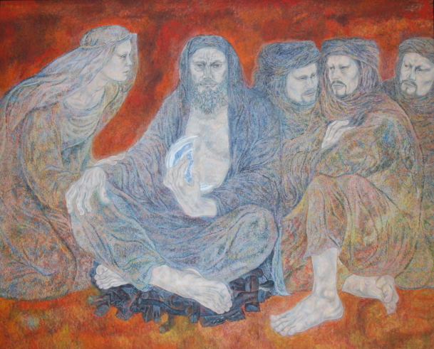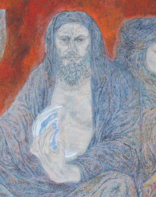 今から100年前の、中国清朝期の漢訳聖經(聖書)に記された約伯記(ヨブ記)と、明治期の文語訳聖書より着想を得て、描きました。欧州の絵に描かれるヨブは、時に弱々しく無力な老人の姿で表されます。しかし漢訳聖經で描かれた約伯からは、一族を率いるどっしりとした仁者、といった印象を受けます。 那人完全正直 敬畏上帝 遠離惡事 鳥斯の地に約伯と名くる人あり 其の人と為完全かつ正しくして 上帝を畏れ 悪に遠ざかる (約伯記 第一章第一節より) 約伯記は、昔からさまざまに論議をよんでいる書物です。心理学者のユングが書いた『ヨブへの答え』などは有名ですが、誰もがこの物語にさまざまな解釈をつけ、しかし誰もが本当には自身の説明に納得していないようにも思えます。また、ゲーテの『ファウスト』やドフトエフスキーの『カラマーゾフの兄弟』、ミルトンの『失楽園』等の文学や芸術作品にも影響を与えた書物として知られています。 約伯記が今の形に書かれたのは紀元前六世紀、中国では春秋戦国時代にあたります。物語の背景となっている時代は、そこからはるかに遡った紀元前十八世紀ころの、鳥斯という西アジアの辺境地。心正しく、財産にも家族にも恵まれていた遊牧民の族長約伯が、一夜にして愛する子供たちも財産も、ことごとく失ってしまうところから、この物語は始まります。自らも重い皮膚病をわずらい、陶器の破片で体の膿を掻き出しながら灰の中に座り込む約伯。そこに三人の友人と一人の若者が尋ねてきます。約伯のあまりの変わりように友人たちは動揺して悲しみ、またかける言葉もなく、七日七晩、四人は約伯と共に地面に座し続けます。 悲惨な状況の中でも天を恨むことなく、深く沈黙していた約伯でしたが、しかし友人たちの眼差しの中で、突然大地の底からわきあがるような悲痛な声を上げ、そして、天と自らに向かって激しい怨嗟の言葉を吐きはじめます。 我が生まれし日 亡せよ 男子(おのこ)胎に宿れりと言ひし夜も亦然あれ その夜は暗くなれ その夜の晨星は暗かれ その夜には光明を望むも得ざらしめ 東雲の目蓋を見ざらしめよ 何とて我は胎より出でしや 如何なれば(母の)膝ありて我を接(う)けしや 如何なれば乳房ありて我を養ひしや 我 かの荒墟を自己のために築きたりし世の君達・臣達と供にあり かの黄金を有ち 白銀を家に充たしたりし牧伯達と供にあらん また 人しれず堕りたる胎児のごとくにして 世に出でず また 光を見ざる赤子のごとくならん 彼處にては 悪しき者 虐遇を息め 倦憊れたる者 安息を得(う) …… それ全能者の箭(や) わが身に入り わが魂神 その毒を飲めり 上帝の畏怖 我を襲ひ攻む そして天にむかい、また自らにむかって問いかけます、 人間とは何か。(約伯書七章十七節) さまざまに理由を掲げて約伯の境遇を説明しようとする友人達を、『わが兄弟、わが望を充たさざること渓川の如し』としてことごとく退ける約伯の言葉には、楚辞に記された春秋戦国時代の屈原の詩のような、鬼気迫るものがあります。また、存在の不条理さと真正面から向き合い、絶望しているかのようであって、しかしその中で激しく道を問う約伯の姿に、私は、『朝に道を聞けば、夕に死すとも可なり。』といった大聖孔子と同じ気迫をさえ感じます。 約伯と四人の長い問答の後、突然、大風の中に上帝(shang-di 中国語訳での神)が現れ、物語は一挙に終幕を迎えていくのですが、上帝が現れる直前の五人を、今回は絵にしてみました。 『人間とはなにか。』という約伯の言葉に触発され、描き始めましたが、主題のもつ深さに比べて、やはり私の力量不足を痛感せざるを得ませんでした。 追記 「日本人なのに、なぜ聖書の題材など描いたのか。」と、よく知人に言われます。 古代西アジアの研究で有名な三笠宮崇仁殿下は、聖書について「初めは文明を誇る白人がなぜこんなものを信じるのかと笑ったが、聖書が歴史的事実と知ったとき、聖書から離れられなくなった。」と語られています。 形而上的真理や神学を大上段に構え持った基督教の聖書解釈(特に旧約解釈)は、朱子学の論語解釈のように時に窮屈で、時に人間の実感から大きく逸脱しているようにさえ思えます。また、多神教対一神教の対立構造を持って、聖書の中に恣意的に不寛容さや否定的見解を導き出そうとする昨今の日本人の姿勢にも、私は疑問を感じます。 三笠宮殿下の言葉に、私は、聖書という書物を読み解く一つの大切な鍵があると思っています。初めに解釈ありき、ではなく、まずはあるがままに読む。そうすると、そこに私たちと同じ人間の歴史、 苦悩や喜び、その足跡が見えてきます。そしてそこではじめて、たとえばこの約伯記の「人間とは何か。」という問いかけが、切実に、洋の東西を問わない、人類に共通する普遍的な問いかけとして、胸に迫ってくると思うのです。 西洋や東洋、民族や宗教といった、人の生み出した「概念」を一時頭から捨て去ってみて、眼中よ